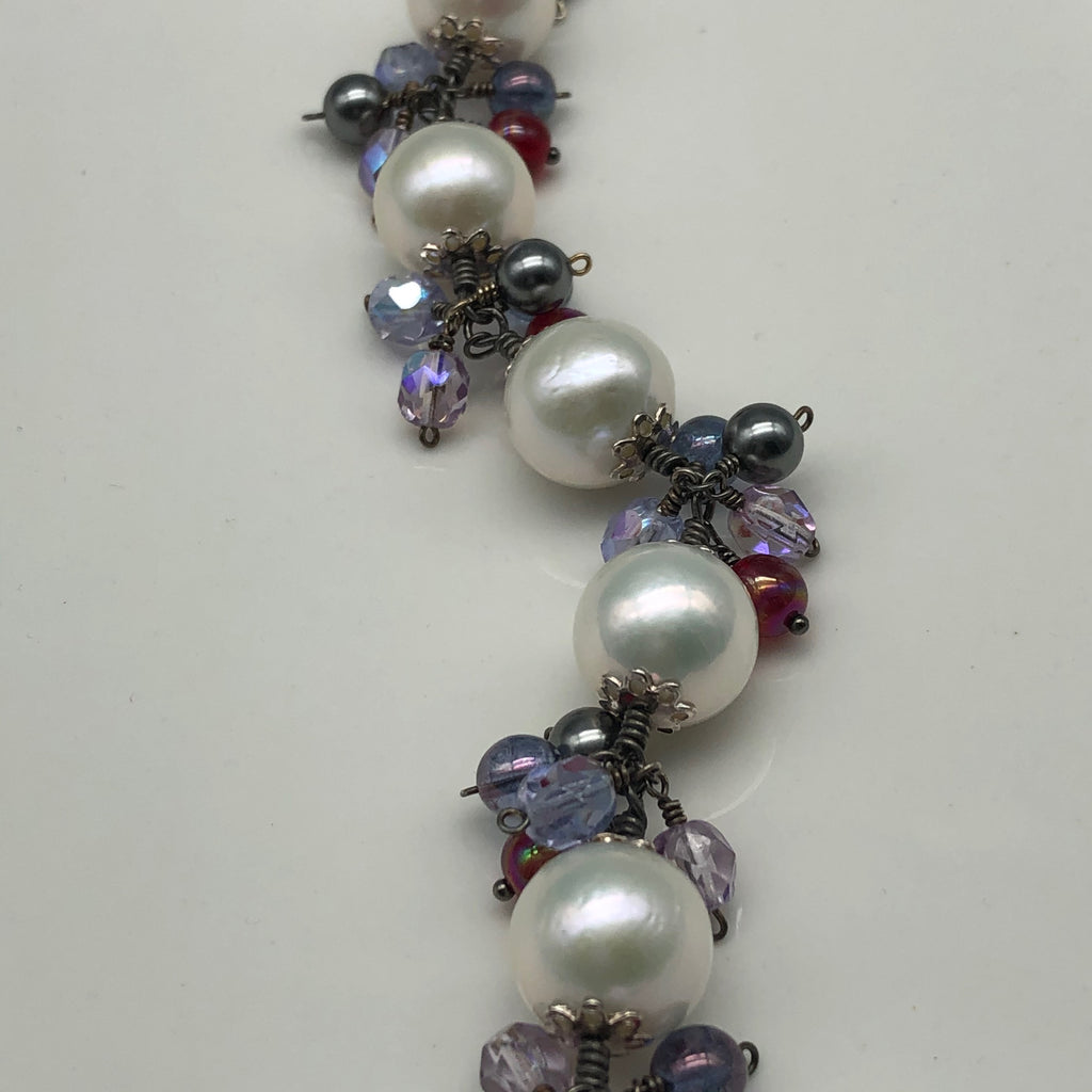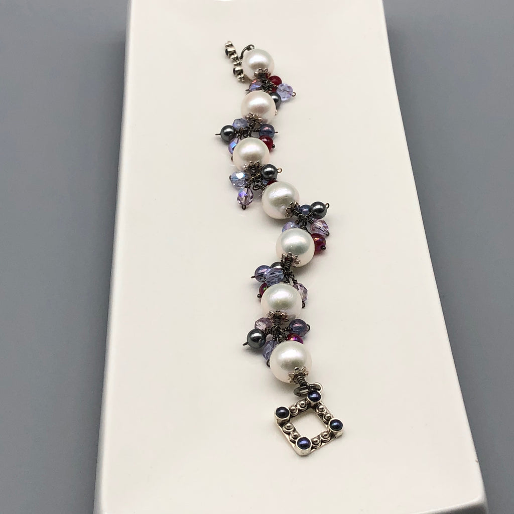 13-14mm Freshwater pearls wrapped in oxidized sterling silver wires and accented with Czech glass beads and finished with a fancy sterling silver toggle. Will fit slim wrist 7 1/4. Simply magical and elegant!