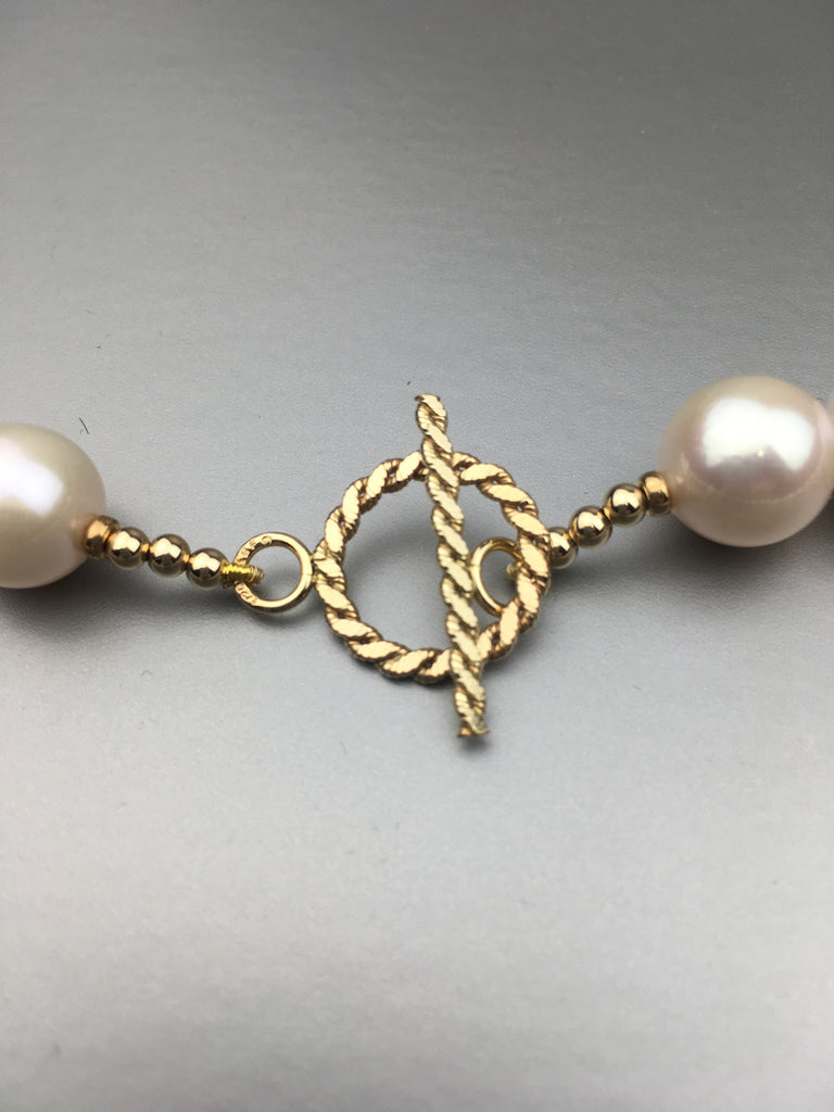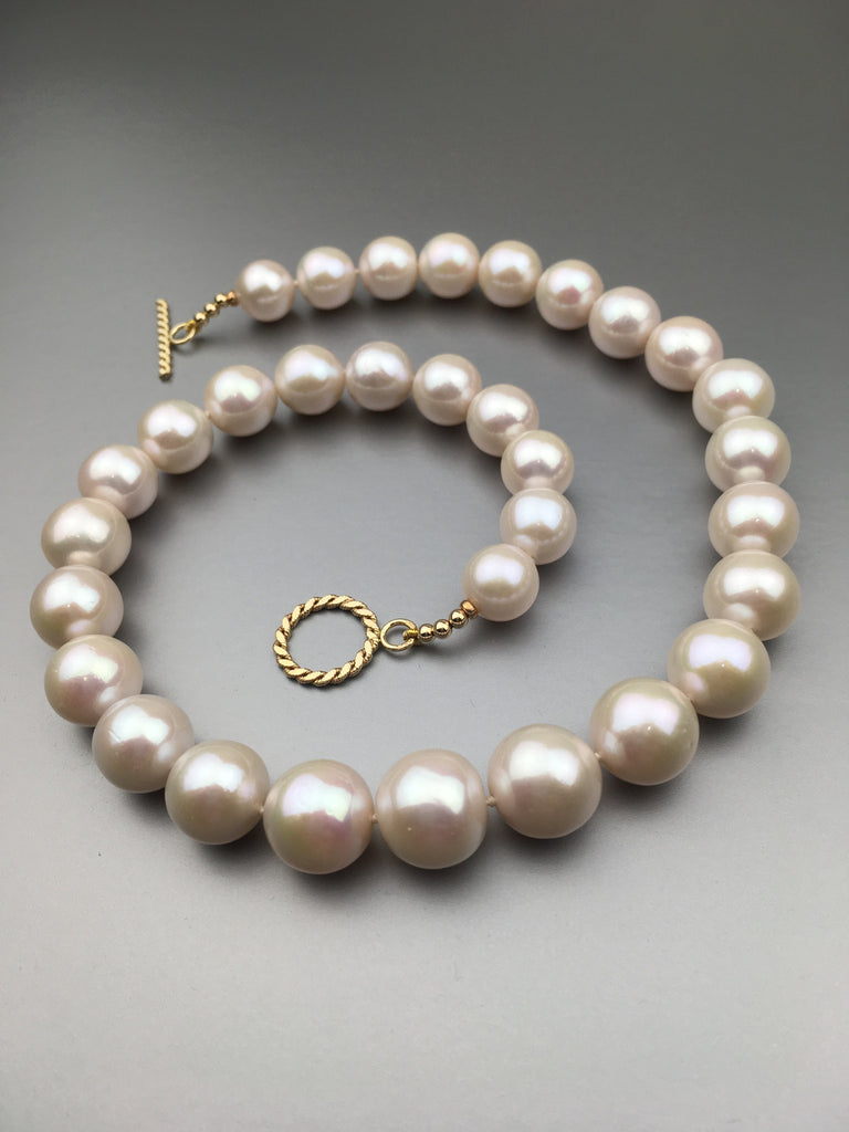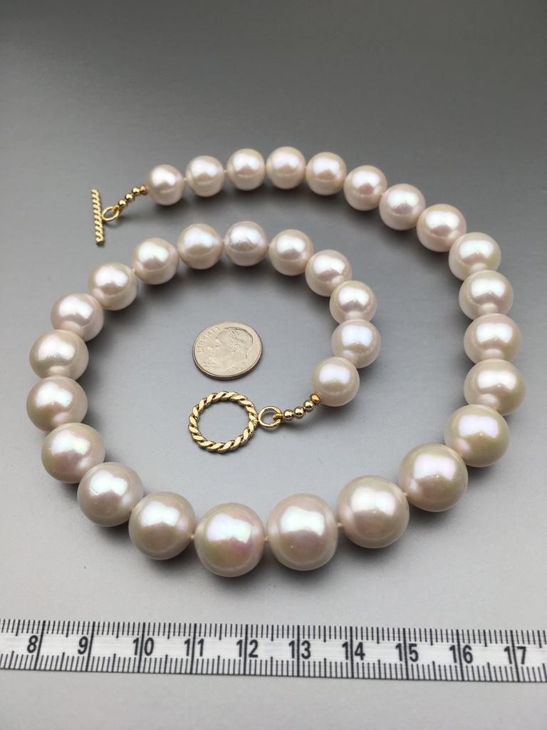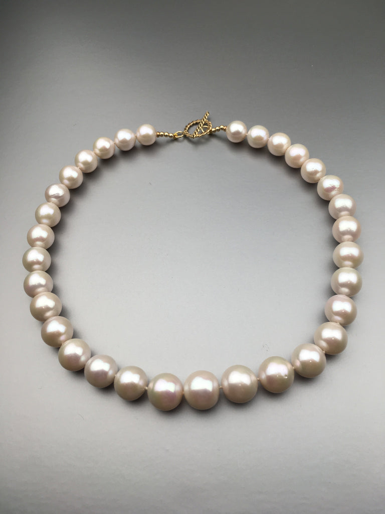 Graduated near round white 11-14 freshwater pearls, good luster with a much coveted size that can be seen from afar and enjoyed close-up. May have a few line etching here and there which are hardly noticeable unless you hold them a few inches from your eyes, but gorgeous just the same and worth its price. Each pearl is individually hand knotted with care using durable polyethylene thread to hold the pearls' weight and yet allow for flexibility. This necklace will drape around your neck just perfectly. I decided to use a gold filled fancy toggle clasp that also serves as an accent. Shall we name this necklace Milan just for fun? Measures approximately 18 inches. Simple yet oh so VERY ELEGANT!